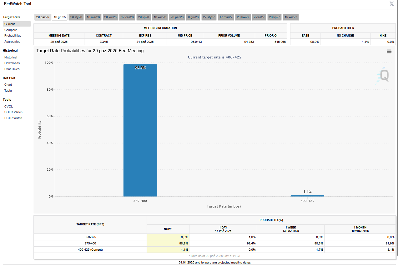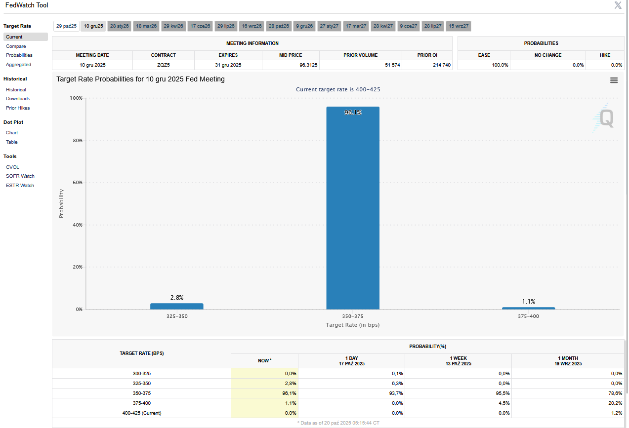 - FedWatch Tool (CME) na dzień 20 października 2025 dla październikowego posiedzenia FOMC: