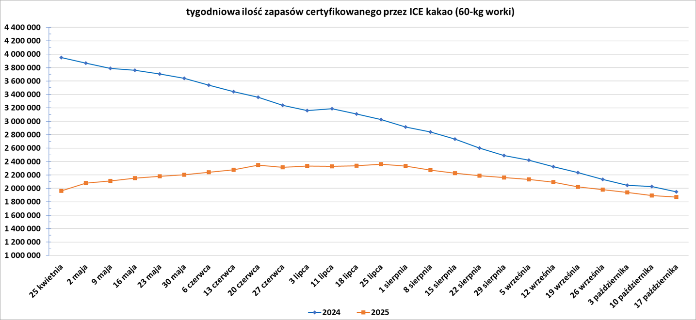 - Zapasy kakao w magazynach ICE spadły 12. tydzień z rzędu (-24,9k t/t), w poprzednim sezonie zmiana wynosiła -78,4k t/t. Zapasy są w tym sezonie o -4,01% s/s niższe.