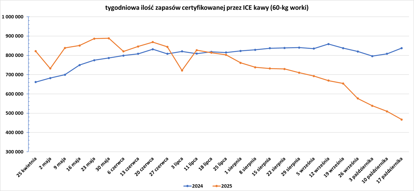 - Zapasy kawy w magazynach ICE spadły 14. tydzień z rzędu (-42,3k t/t) spadając poniżej 0,5 mln worków, w poprzednim sezonie zmiana wynosiła +29,3k t/t. Zapasy są w tym sezonie niższe o -44,23% s/s. Na ocenę jakości oczekuje 5,58 tysięcy worków (+3,96k t/t).