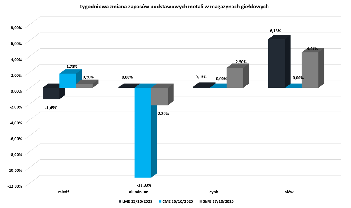 - Tygodniowe zmiany zapasów kluczowych metali przemysłowych w magazynach giełd CME (NYMEX & COMEX), szanghajskiej (ShFE) i londyńskiej (LME) giełdy: