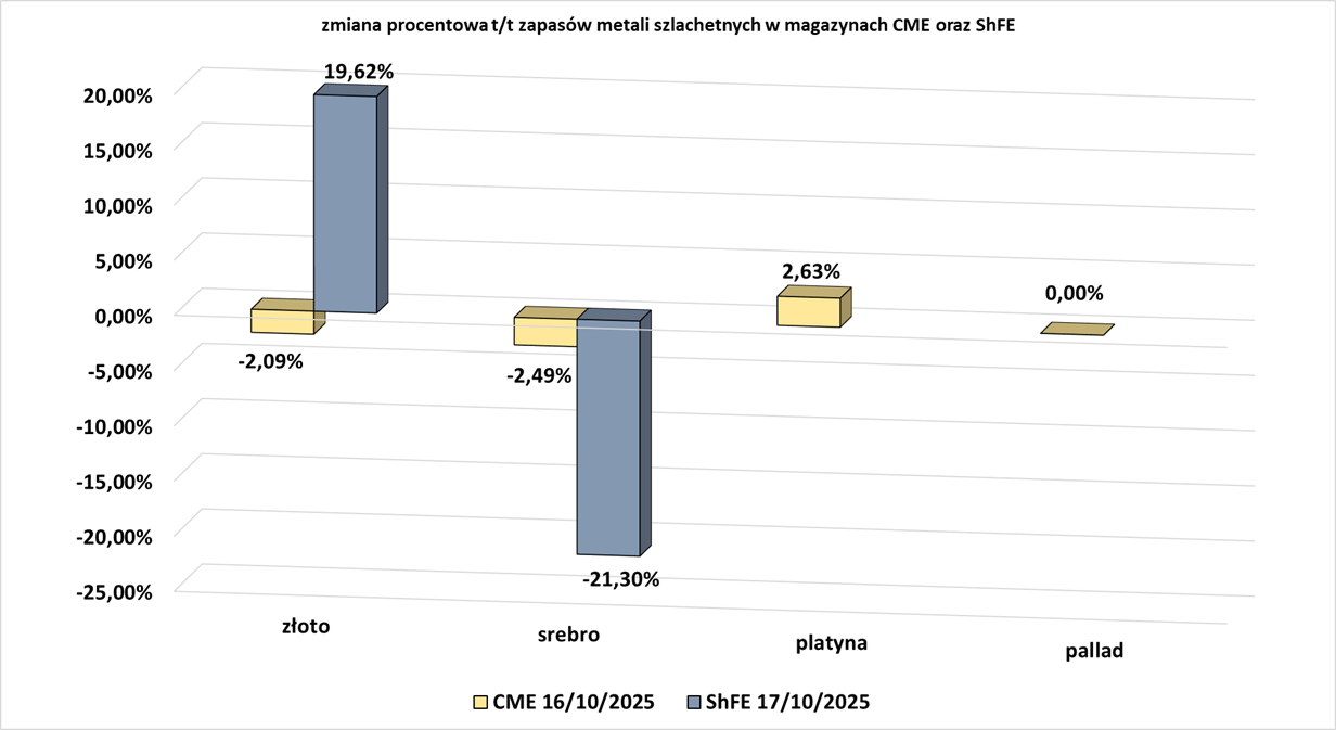 - Tygodniowe zmiany zapasów metali szlachetnych w magazynach giełd CME (NYMEX & COMEX) i szanghajskiej (ShFE):