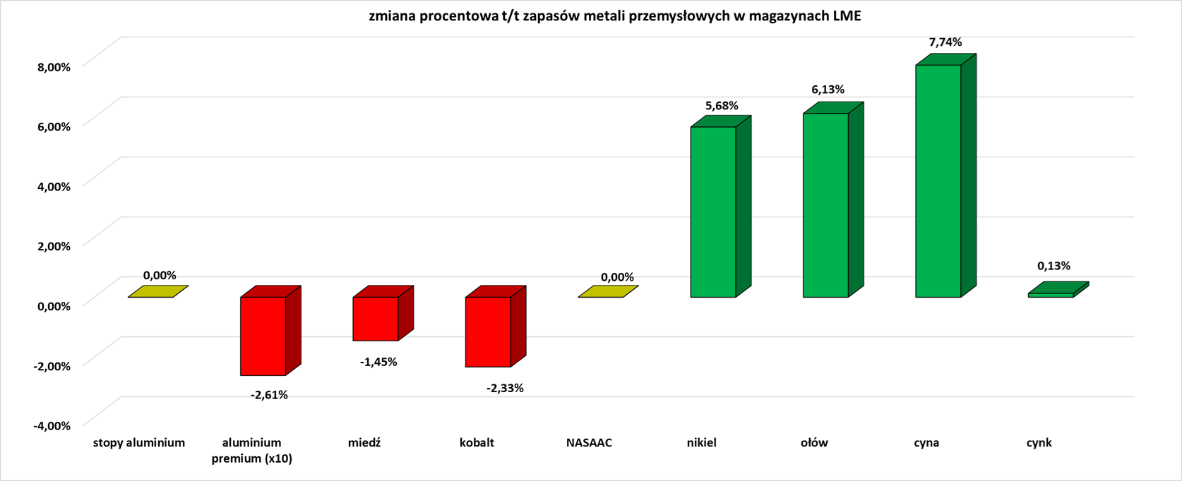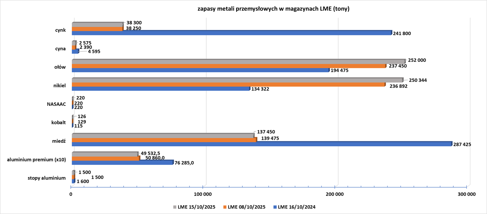 - Zapasy metali przemysłowych w magazynach Londyńskiej Giełdy Metali (LME):