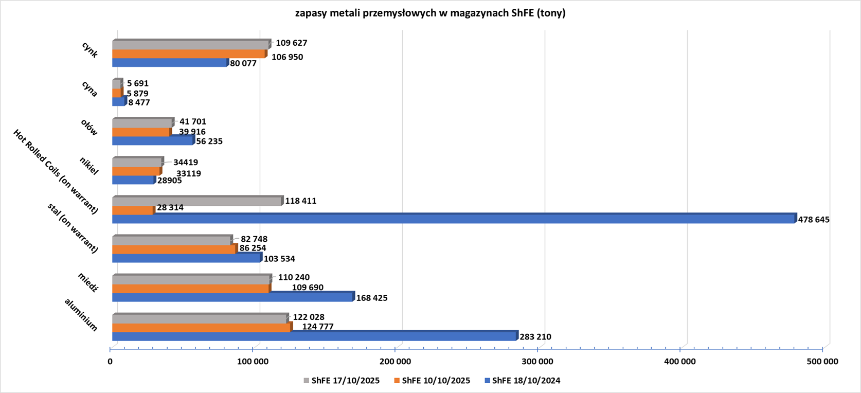- Zapasy metali przemysłowych w magazynach Szanghajskiej Giełdy (ShFE):