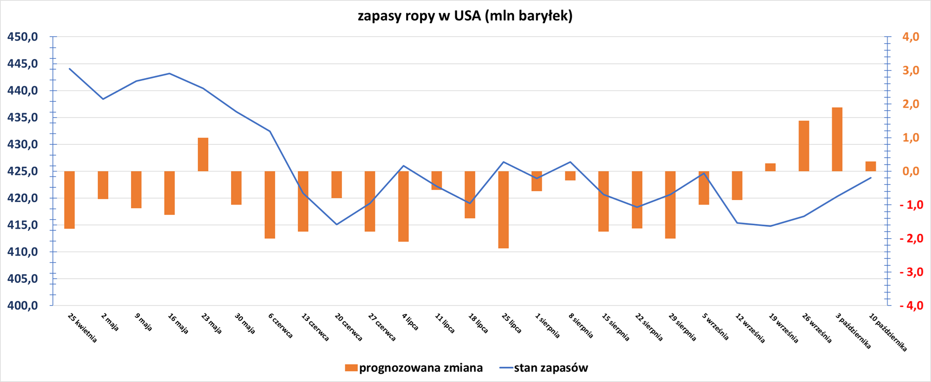 - Zapasy ropy naftowej w USA w tygodniu do 10 października zmieniły się o +3,5 mln baryłek, do 423,8 mln baryłek, prognozowano zmianę o +0,288 mln baryłek. Poniższy wykres pokazuje zmianę zapasów ropy w USA w ciągu ostatnich 25 tygodni: