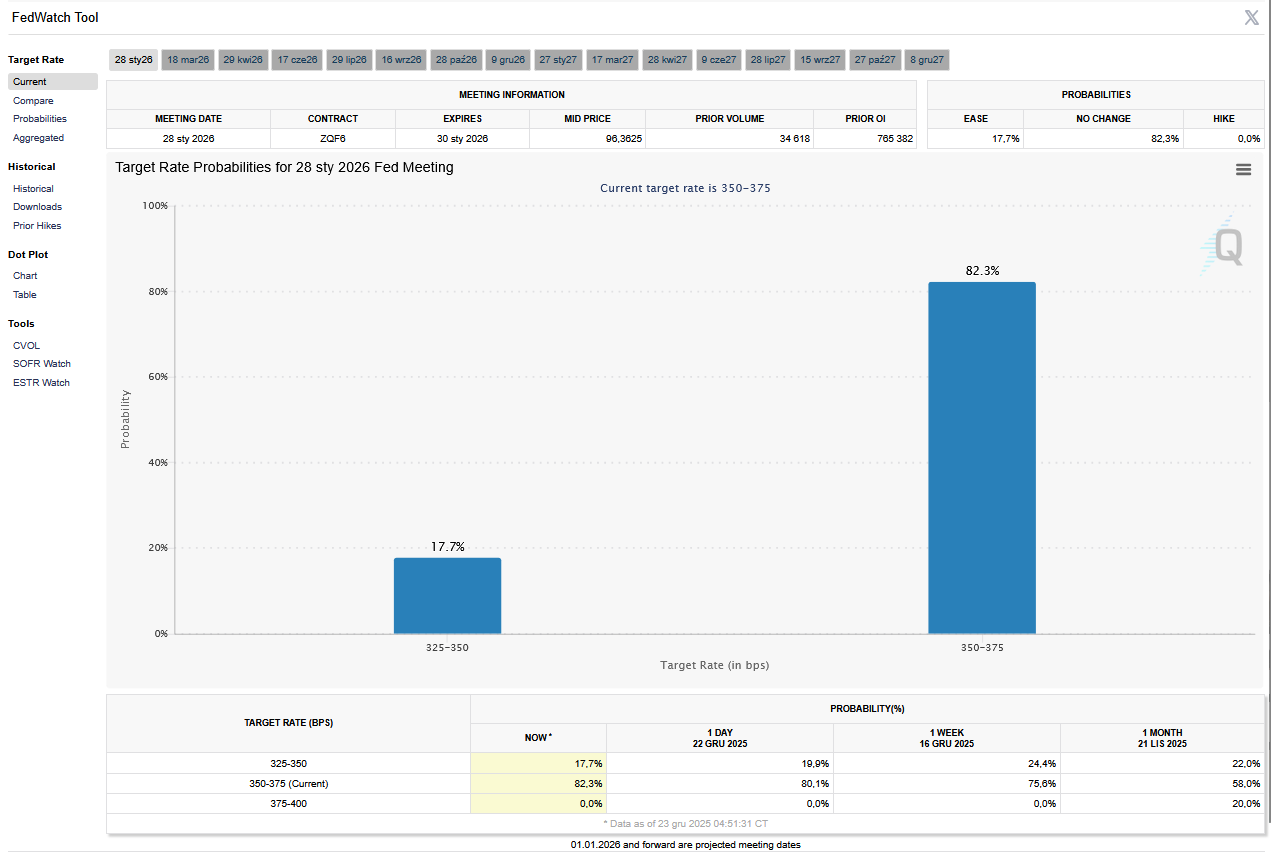 - FedWatch Tool (CME) na dzień 15 grudnia 2025 dla styczniowego posiedzenia FOMC: