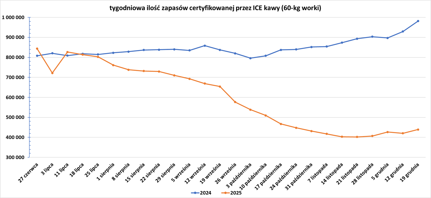 - Wg raportu Coffee: World Markets and Trade (USDA), sumaryczna produkcja kawy w sezonie 2025/26 wyniesie 178 848 tysięcy 60-kg worków. Arabici będzie 95 515 tysięcy worków (53,4%), a robusty 83 333 worków (46,6%). Produkcja 178,848 mln 60-kg worków (+0,09% względem poprzedniej prognozy; +2,01%), konsumpcja wyniesie 173,852 mln worków (+2,65% względem poprzedniej prognozy; +1,34% s/s), a zapasy końcowe wyniosą 20,148 mln worków (-11,71% względem poprzedniej prognozy; -5,44% s/s). Bilans to nadwyżka 4,996 mln 60-kg worków (spadek nadwyżki o 4,3 mln worków), co stanowi 2,79% produkcji.